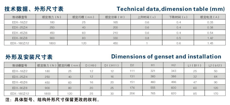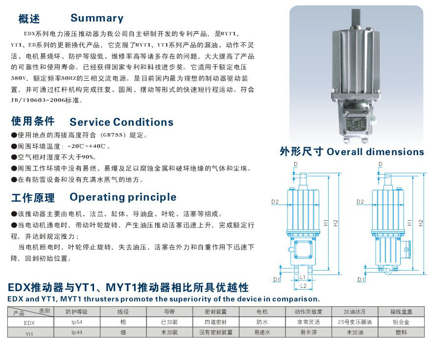 EDX系列電力電壓推動(dòng)器為我公司自主研制開發(fā)的專利產(chǎn)品,是MYT1、YT1、ED系列的更新?lián)Q代產(chǎn)品,他克服了MYT1、YT1系列產(chǎn)品的漏油,動(dòng)作不靈活、電機(jī)易燒壞,防護(hù)等級(jí)低、維修率高等諸多存在的問題,大大提高了產(chǎn)品的可靠性和使用壽命。已經(jīng)獲得國家專利和科技進(jìn)步獎(jiǎng)。它適用于額定電壓380V,額定頻率50HZ的三相交流電源,是目前國內(nèi)理想的制動(dòng)器驅(qū)動(dòng)裝置,并可通過杠桿機(jī)構(gòu)完成往復(fù)、圓周、擺動(dòng)等形式的快速短行程運(yùn)動(dòng),符合JB-/T10603-2006標(biāo)準(zhǔn)。